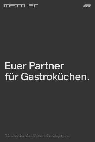 Mettler steht für funktionale, beständige Gastroküchen, die sie in enger Zusammenarbeit mit Gastronomen erstellen. Darüber hinaus begleiten sie Betriebe mit einem zuverlässigen Gastroservice. Der neue Auftritt vermittelt die vielfältigen Leistungen und füllt die Marke zugleich mit Geschichten von Mitarbeitenden sowie der Kundschaft. Aus dem Zusatz «Gastrotechnik AG» wird der Claim «Euer Partner für Gastroküchen». Er betont die enge Zusammenarbeit, die weit über technische Ausstattung hinausgeht. Diese Nahbarkeit zieht sich durch alle Elemente der Kommunikation: von der Sprache über die Bildwelt und bis zur Domain der Website. «mettler-chuchi.ch» bringt die Identität der Marke auf den Punkt und betont Swissness, ohne auf Klischees zurückzugreifen.